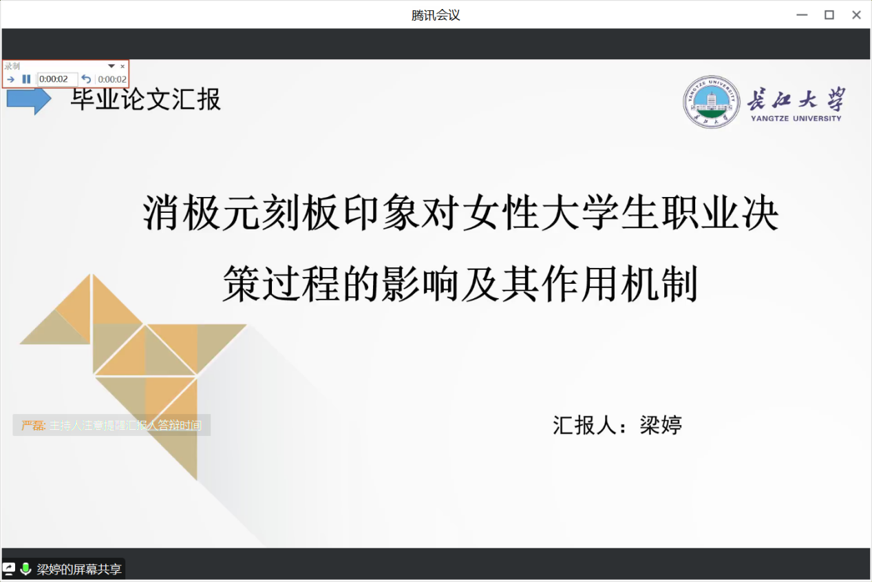 (通讯员:魏文欣)2023年3月29日晚19点至21点,第132期社会心理学学术例会在腾讯会议上举行。出席本次例会的有严磊老师以及13名研究生和2名本科生。本次例会由研一韩淼主持,研三梁婷、陈思园和罗学敏进行硕士毕业论文预答辩,其汇报分别为《消极元刻板印象对女性老员工职业决策过程的影响及其作用机制》、《疫情背景下群体认同对老员工幸福感的影响:社会联结与核心自我评价的链式中介作用》、《权力感对老员工亲社会行为的影响:一个链式中介模型》。